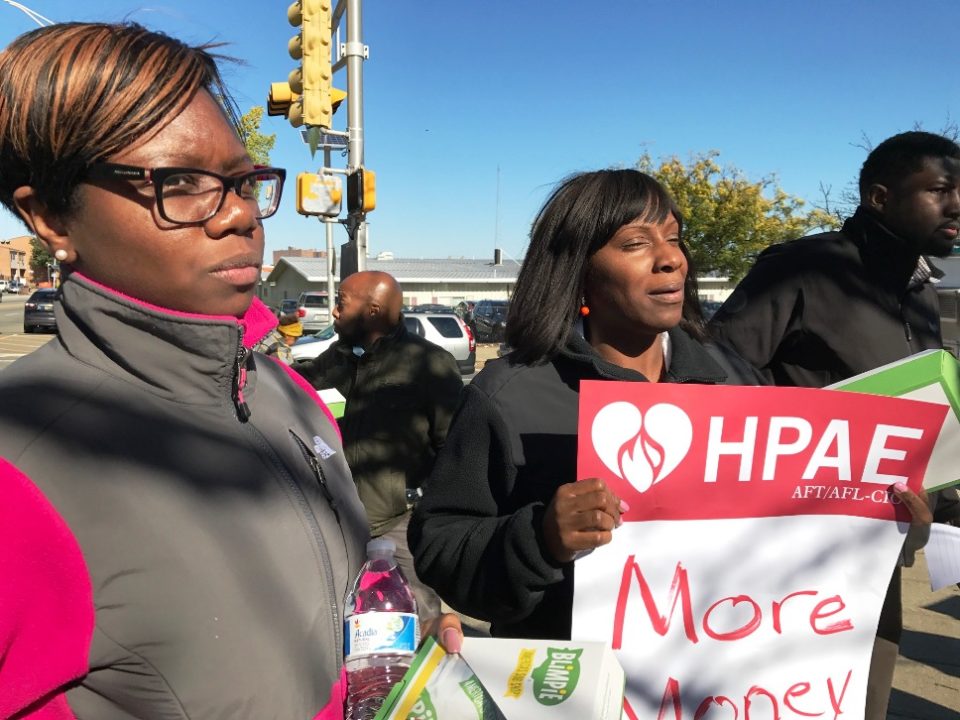 Members of HPAE Locals 5089 (RNs) and 5094 (non-nursing professional staff) at University Hospital (UH) in Newark held a lunchtime rally and picket today as a show of unity between the locals and to kick off their contract campaign.