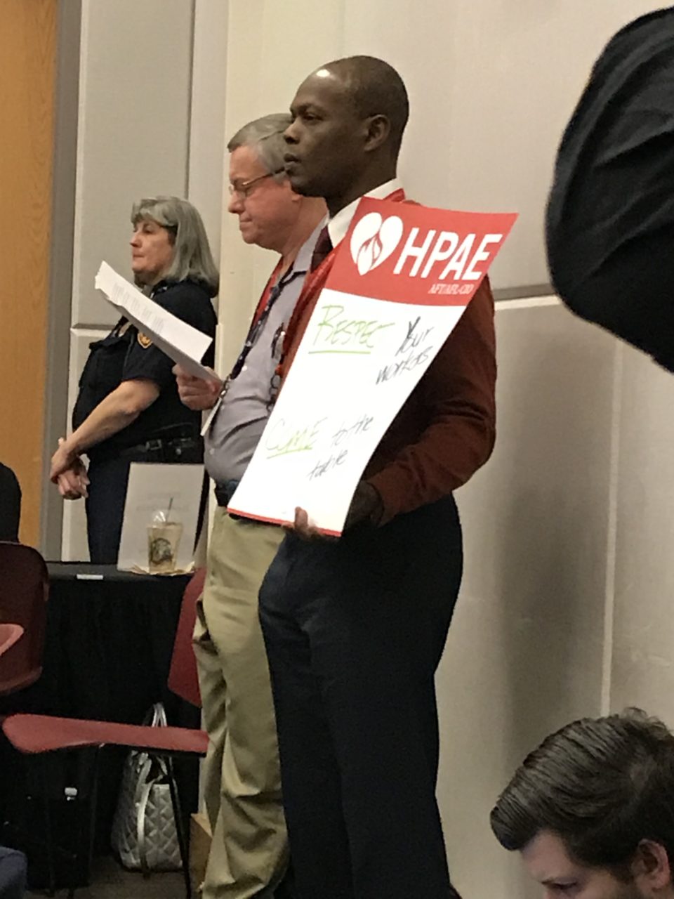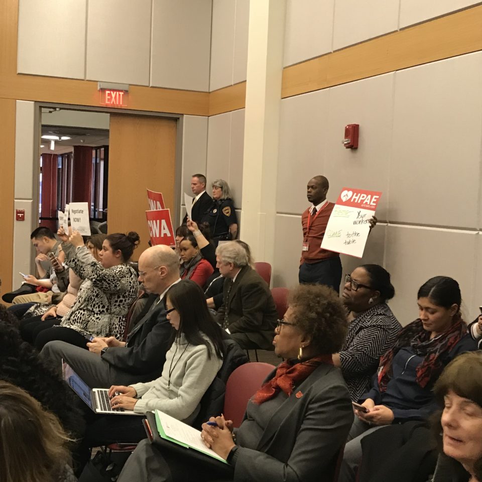 On Wednesday, February 7, HPAE members and Rutgers Union Coalition partners joined forces at February meeting of the Rutgers Board of Governors. HPAE, along with its coalition partners, has asked Rutgers for dates to begin bargaining to which Rutgers has yet to respond.