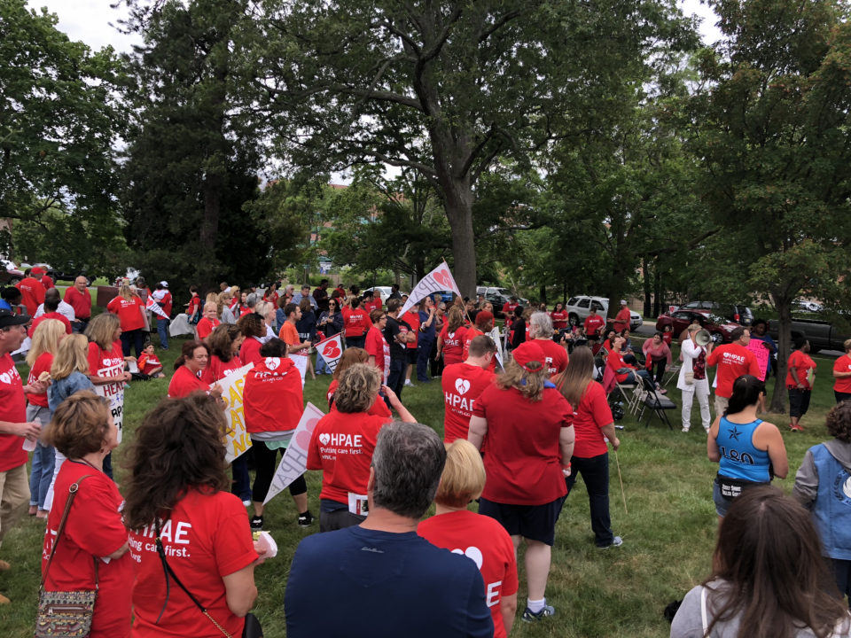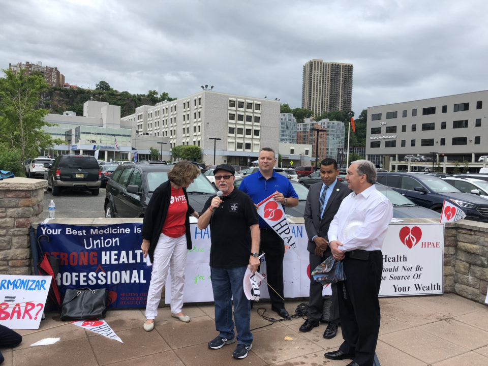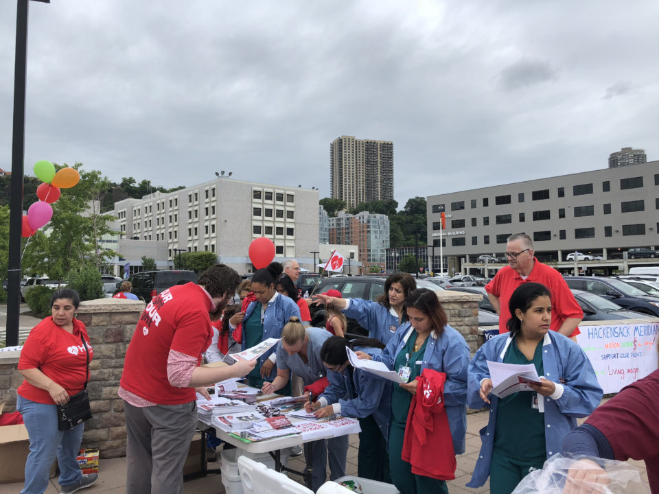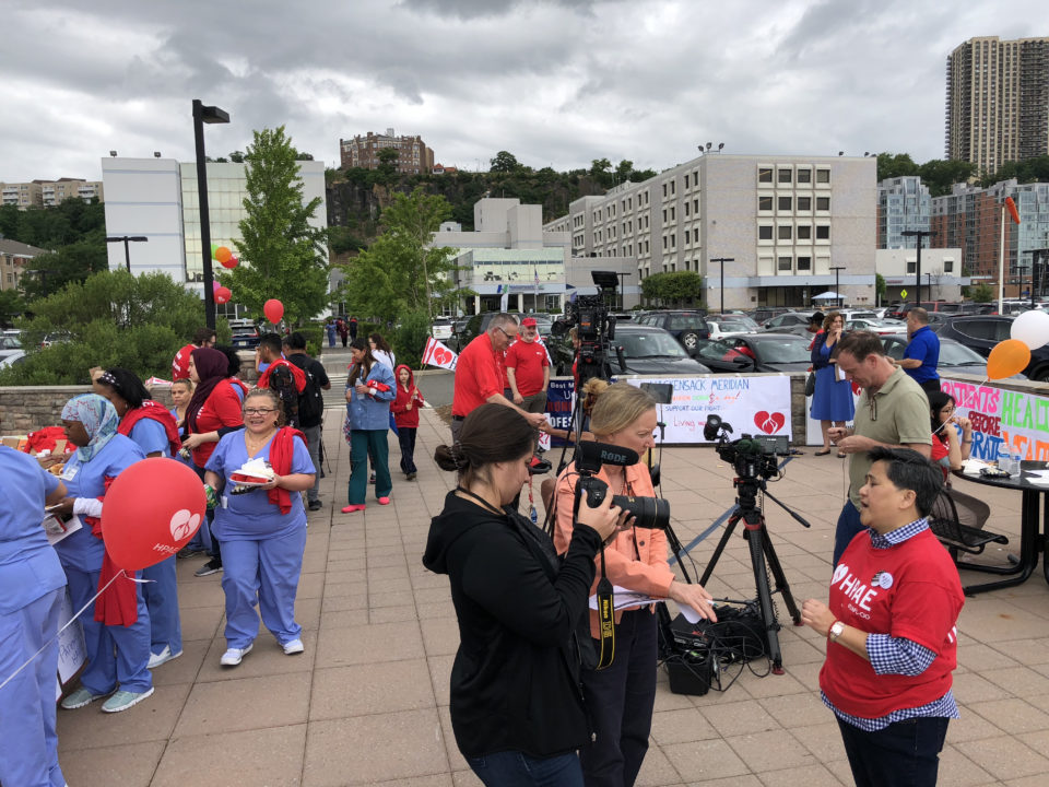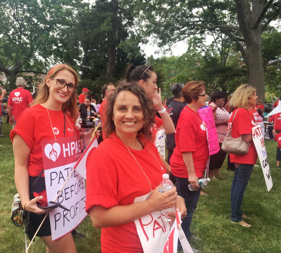 (North Bergen and Neptune, NJ) – Nurses and health professionals bargaining with NJ’s largest healthcare corporation, Hackensack Meridian, held a Rally for Healthcare on Wednesday, June 27. At the bargaining table, 3,000 health professionals represented by HPAE, are demanding protections for patients’ safety and financial security as well as workers’ rights so they can continue advocate for themselves, their patients and their community.