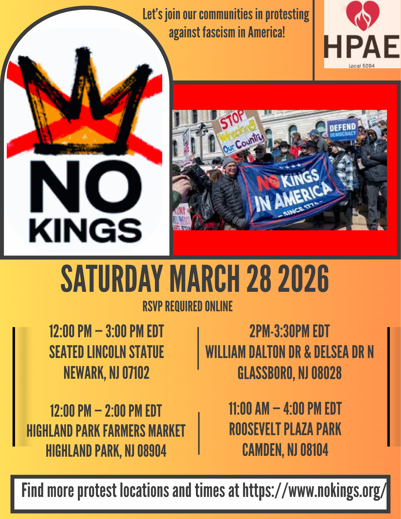 On Saturday, March 28, we will take action together. Join your Local 5094 leadership in Newark or Highland Park, or HPAE President Debbie White in Glassboro this weekend, details in the above graphic. If you prefer to attend in a different location/closer to home, please take pictures and share them with us on Instagram or Facebook (@hpaelocal5094).