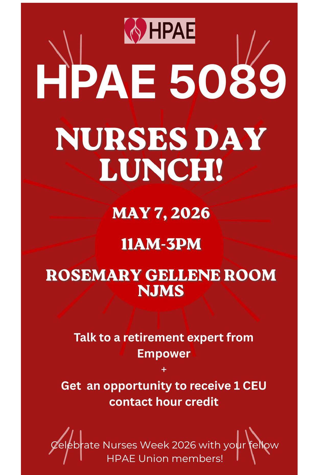 You are cordially invited to join your fellow HPAE represented Nurses in a Nurses Week celebration! Come for a break and a chance to relax with your coworkers. A representative from Empower will be present to answer your questions about retirement, and there will also be an opportunity to get a 1 CEU credit.